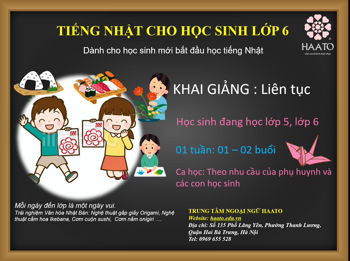 Trung tâm Ngoại ngữ HAATO tổ chức lớp học tiếng Nhật dành riêng cho học sinh lớp 6 với chương trình học phù hợp với độ tuổi.